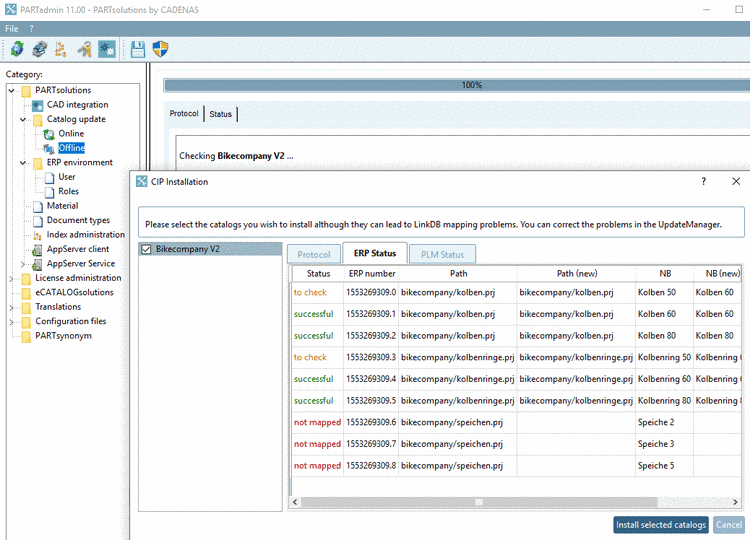 On the tabbed pages ERP Status and PLM Status the individual projects are listed with their status so that you can decide whether to perform the installation.
