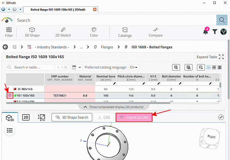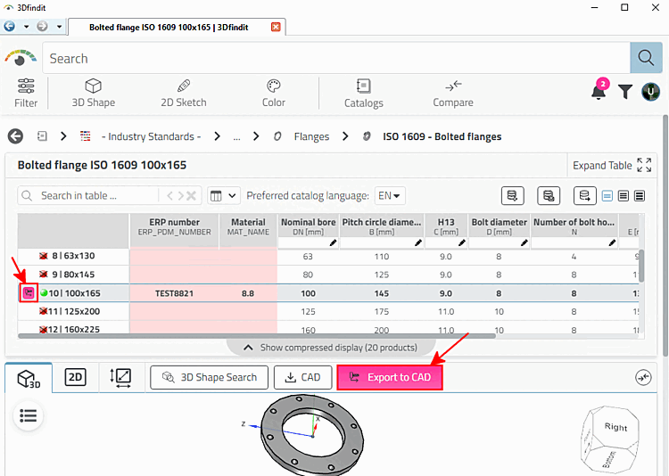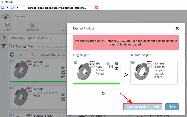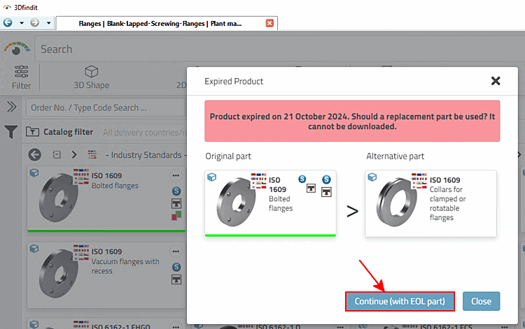 The following illustrations show sample images in 3Dfindit for part selection (opening the part possible or not) and for the table view (part export possible or not).