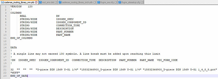 ifugnx.cfg,cadenas_routing_library_mm.ptbandcadenas_routing_library_inch.ptb. This should contain the following piping attributes:The type, number and role of these attributes can be adjusted in the ptb file. Corresponding adjustments must then also be made in