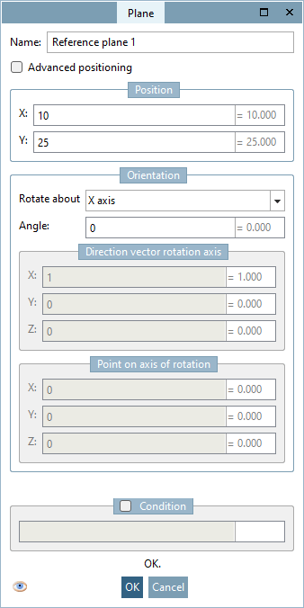 The layer [Plane] window opens, where you can define the name [Name], position [Position], orientation [Orientation] and condition [Condition]. With the Advanced positioning option, you can change the base point [Base point], the X axis [X-axis] and the Y axis [Y-axis]. While the Plane window is open, you can use the eye symbol to display or hide the visualization of the changes.