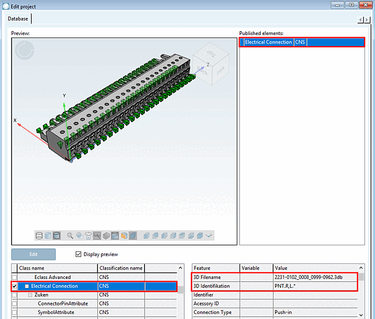 Under Class name, select the Electrical Connection option and activate the checkmark at the beginning of the line.
