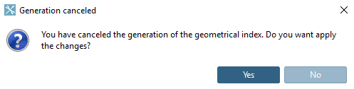 When cancelling the update of the Geometrical search index you there is the possibility to keep the already generated state and continue at a later time, which possibly means a considerable speed advantage.