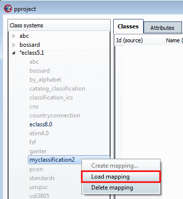 Open the menu for eClass5.1 and double-click on the class system to be mapped (your class system), or click on Create mapping.... [Create mapping...] in the context menu.