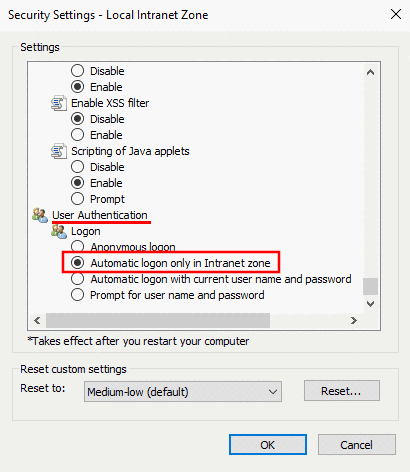 In the dialog "Security Settings - Local Intranet Zone" the option "Automatic logon only in Intranet zone" has to be enabled.
