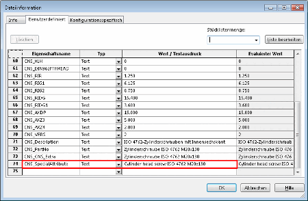 The following figure shows the result in SolidWorks in the "File information" window on the "User-defined" tabbed page.