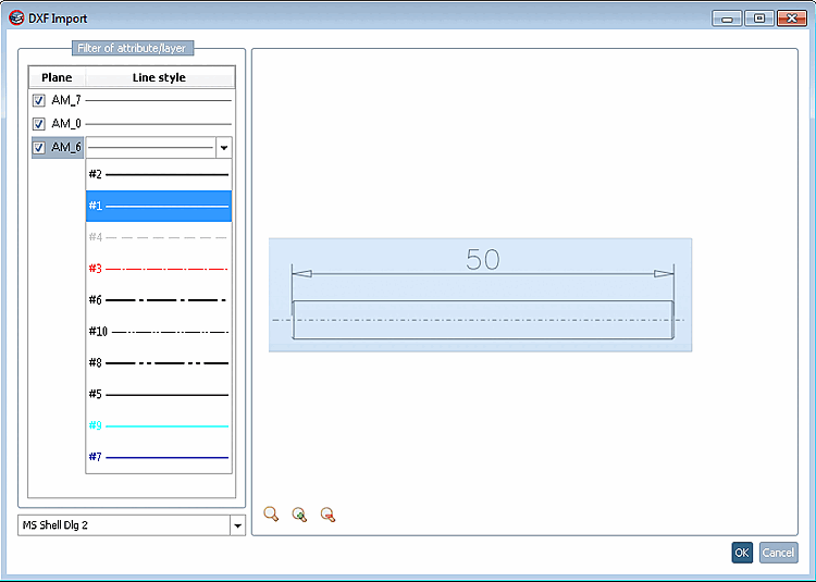 -> The DXF import dialog box appears with the selected DWG/DXF view.