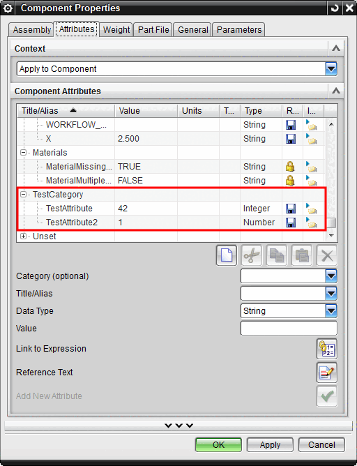 After the part export, the attribute can be found in NX under "Component Properties " in the created category "TestCategory ".