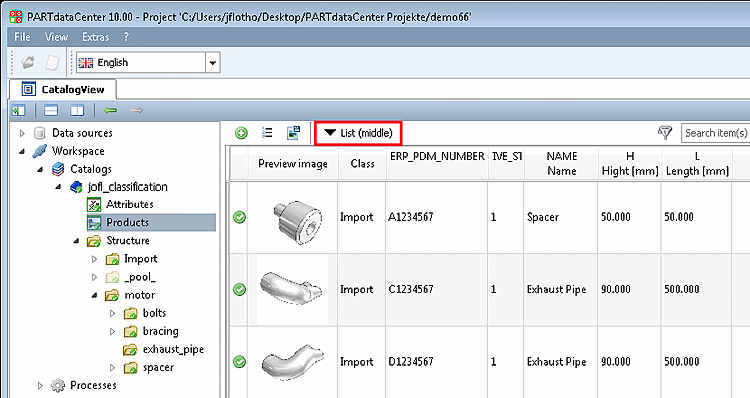 In the Table view type, all attribute names are listed one after the other in a single field. You can also perform a textual search of all products here. The total number of all products is displayed at the top right.