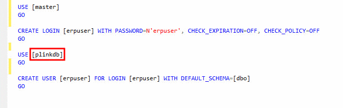 plinkdb_reuse.sql(under..\tools\databases\MSSQL) as template.USE [master] GO CREATE LOGIN [erpuser] WITH PASSWORD=N'erpuser', CHECK_EXPIRATION=OFF, CHECK_POLICY=OFF GO CREATE DATABASE [plinkdb] ON ( FILENAME = N'<DBFILE>' ), ( FILENAME = N'<DBLOGFILE>' ) FOR ATTACH GO if not exists (select name from master.sys.databases sd where name = N'plinkdb' and