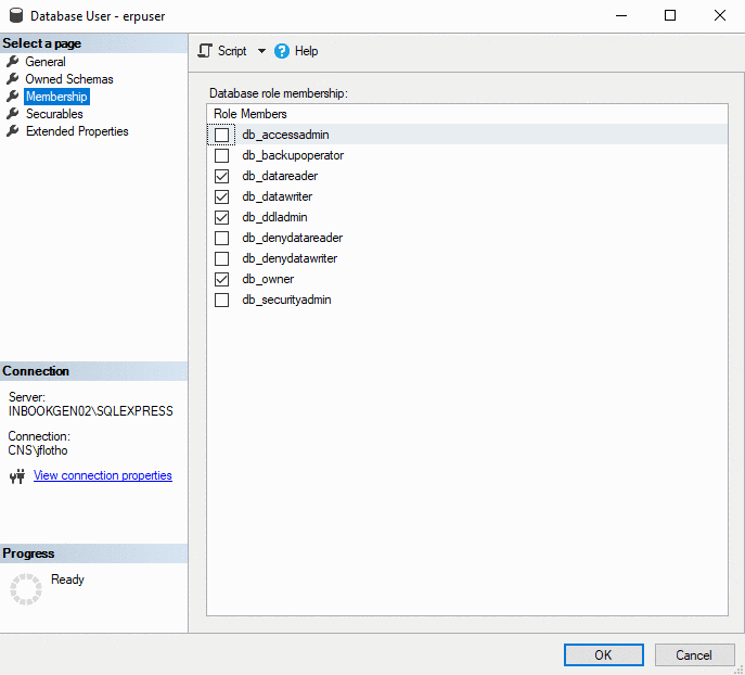 In the dialog box "Database User - <user_name>" define the desired memberships for the respective user and finally confirm with .