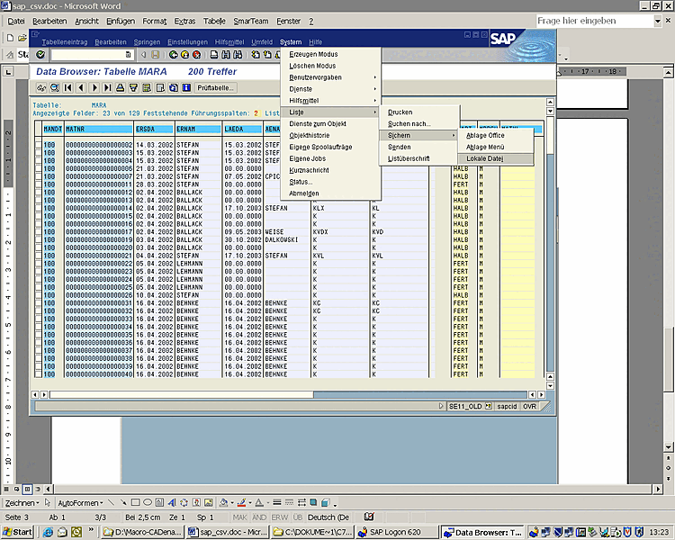 The following screenshots, for example, show the manual CSV export from SAP: