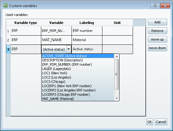 For all reports using Custom variables, you can define certain variables of the characteristic attribute table (ERP variables or geometric variables), in order for the variables to be displayed in the report in addition.