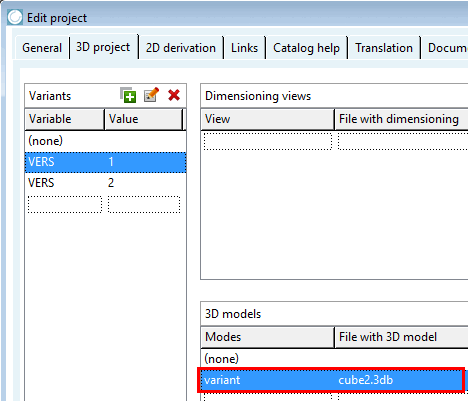 If there is a 3D model assignment for the variant (none) in the Variants dialog area, this variant is used as a "fallback" for all cases in which variants (in the example below "VERS=2") are not assigned a model.