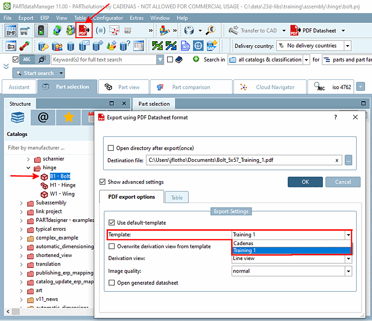 icon to open the Export in PDF Datasheet format dialog box.Select the template created in the list field under Template.