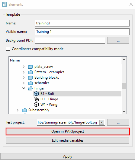 Select the test project [Test project] in the directory tree (here in the example "B1 - Hinge pin").