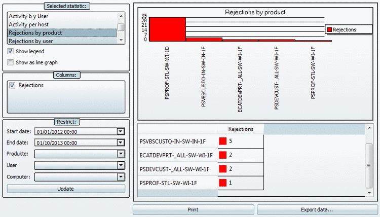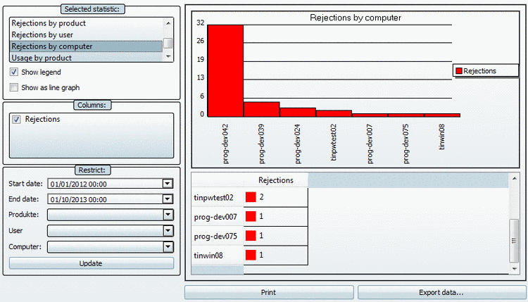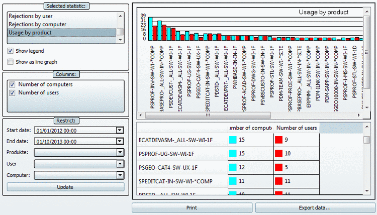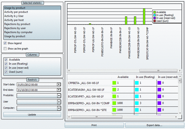 The statistic Usage by product lists the maximally available and used Floating licenses for all products within the defined period of time. If the number of In use (floating) licenses is very close to the number of available licenses, then you should consider the increase of capacity, even if there were no rejections yet. Also see the statistic types Rejections by product, Rejections by user and Rejections by computer.