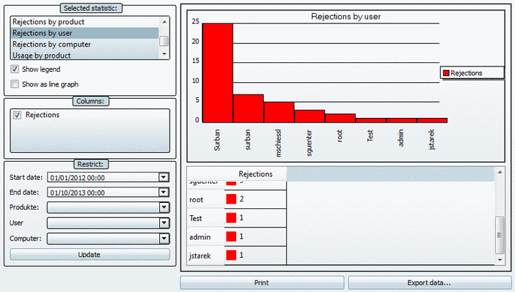 Here you can filter with: Start date, End date, Products, User, Computer