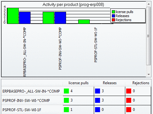 Used (sum): Is according to In use (floating). This statistic type is especially suitable for shorter periods of time, let's say 7:00 to 12:00 of a certain day. You can recognize the level of fluctuation, in relation to a certain product. High fluctuation confirms, that your decision for Floating licenses is correct.