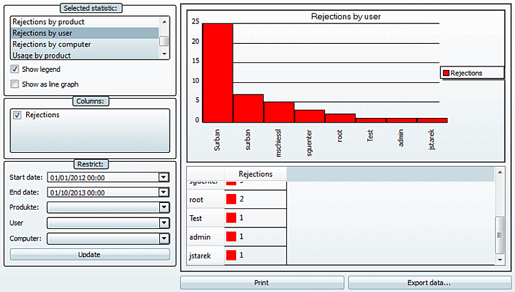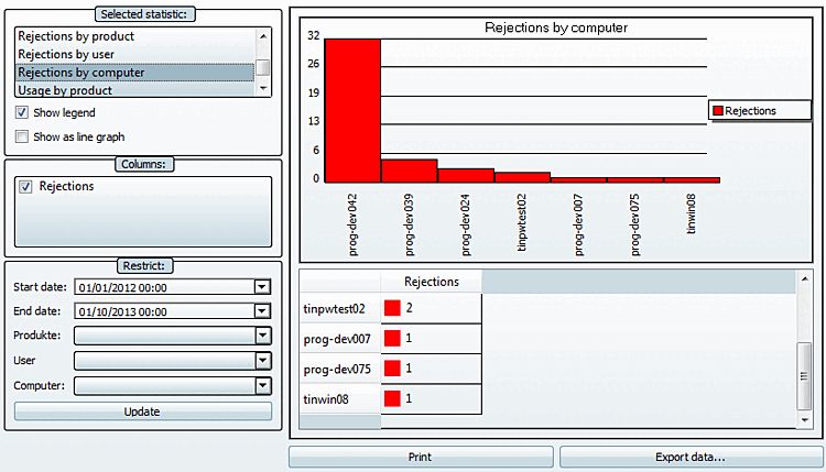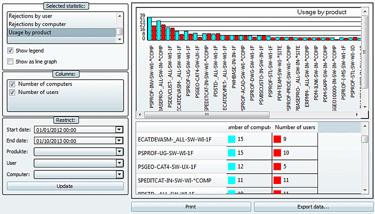 The Occupancy by product [Usage by product] statistic shows the maximum available floating licenses and the maximum number of occupancies in the set period for all available products listed individually. If the number of floating [In use (floating)] licenses is very close to the number of available licenses, an increase in capacity should be considered, even if no rejections have yet occurred. See also the statistics types Rejections per product [Rejections by product], Rejections per user [Rejections by user] and Rejections per computer [Rejections by computer].