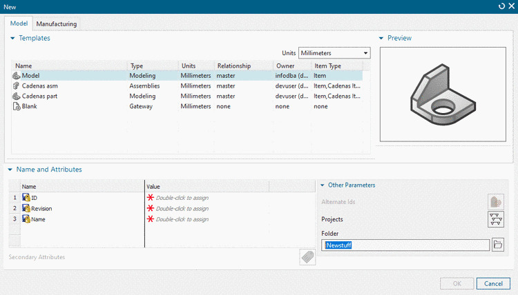 In the New dialog, on the tabbed page Model, under Templates, select a simple template (in this example "Model").
