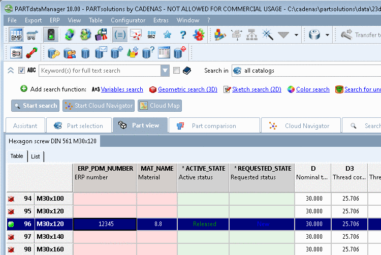 -> The link database dataset with the fields ERP number, Material, Active status and Requested status (default) is immediately shown in PARTdataManager.