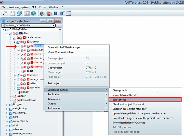 With V9.08 SP1 you will find in PARTproject QA in the context menu under Version management [Versioning system] additionally the command Edit conflict (only in case of conflict).