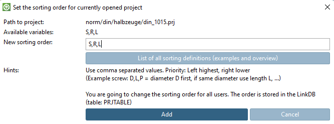 13. If the Set sort order for currently open project [Set the sorting order for currently opened project] function is available (see function is available (see Section 4.25.8.2.7.2, “Explicitly specify sorting order of variants for PARTdataManager table ”), click on the button.