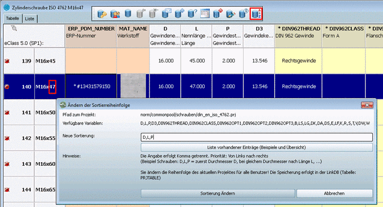 $CADENAS_SETUP/erpcustom.cfg, sectionADDTODB_VARS, key with the value$CADENAS_SETUP/scripts/erp/erp_sorttable.vbb. Should the key not be available, then please insert it yourself.Once the activation of this key is performed, the dialog box Change sorting order? appears, when a variant has been set. Not before the sorting has been explicitly determined for a certain project, the dialog box won't appear anymore.