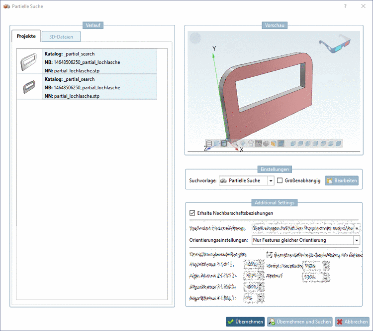 The search detects, whether a part is completely contained in another part: The finished part has to be smaller than the unmachined part, so that it can be produced by removing wasted material. As soon as the extensions of the finished part exceed the ones of the unmachined part only at a certain point, it cannot be used at all or at least badly.