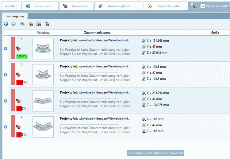 The search calculates the volume of the material to remove (waste). The less material to remove, the higher the ranking in the result list, because this criterion is determining for the manufacturing costs.