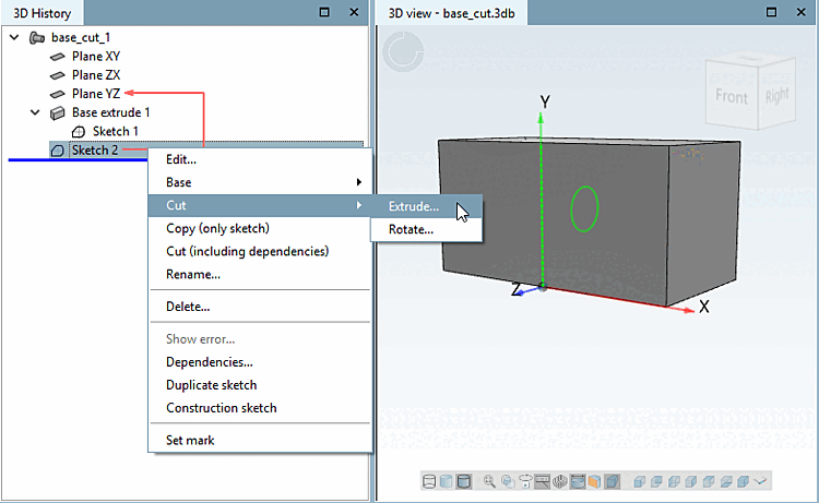 In the 3D history [3D History] under Sketch2, select the context menu command Cut -> Extrude.... [Extrude...]
