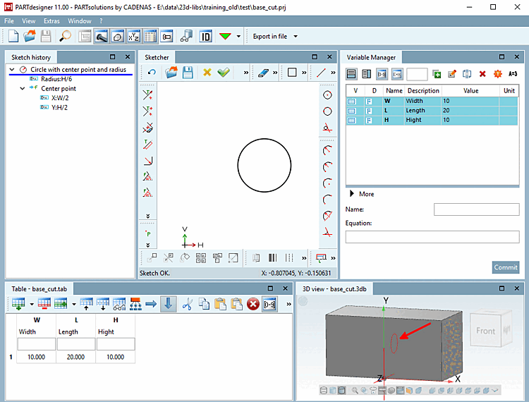 -> Another item (feature) appears in the 3D history [3D History]: Cut extrude 1.