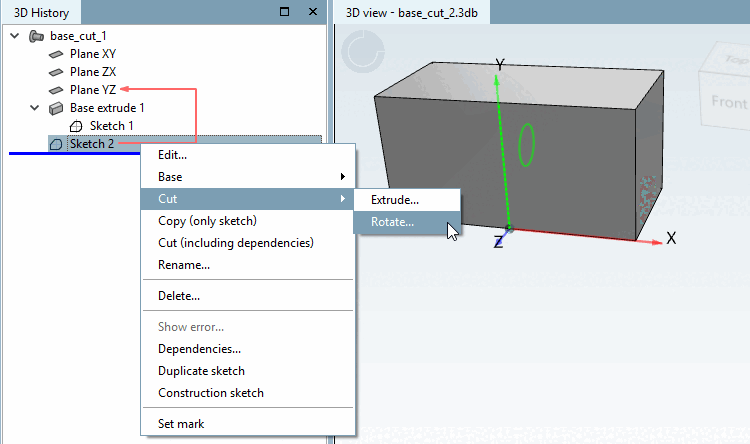 In the 3D history [3D History] under Sketch 2, select the context menu command Section [Cut] -> Rotate.... [Rotate...]
