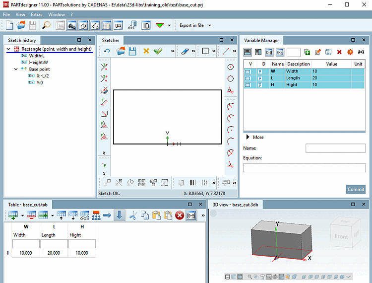 -> Another item (feature) appears in the 3D history [3D History]: Cut extrude 1.
