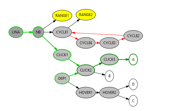 You can display the dependencies of any variable by selecting it with a left-click. The selected variable and all directly dependent variables, as well as variables connected one level higher or lower, are displayed with a green border and arrow. The selection can be canceled by left-clicking on an empty area.