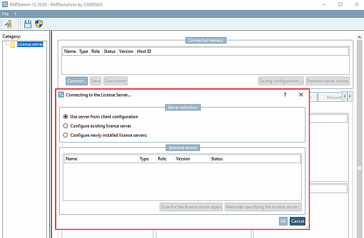 The selected license servers are displayed in the Connected servers dialog area (type and role still set to PASSIVE).