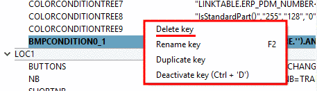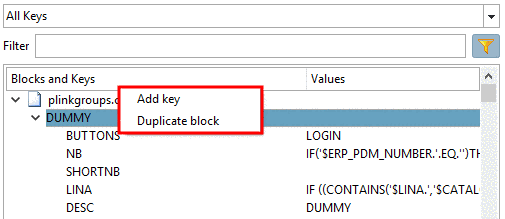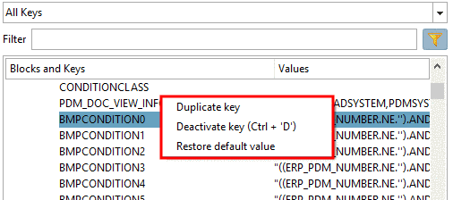 Via context menu command, you can add blocks and keys and duplicate keys. These commands are found in all main directories ($CADEANAS_USER, $CADENAS_SETUP,$CADENAS_DATA/datasetup). Under $CADENAS_DEFAULTUSER you can find further extra commands [see Section 1.7.1.4.4, “Additional functions in $CADEANS_DEFAULTUSER ”]).