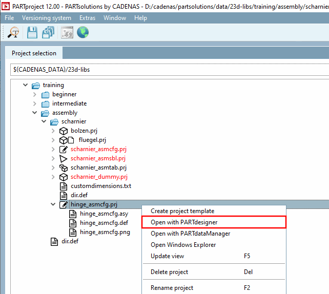 _asmcfg.prj" is automatically appended to the assigned name.In the context menu of the assembly configuration, click on the Open with PARTdesigner [Open with PARTdesigner] command.