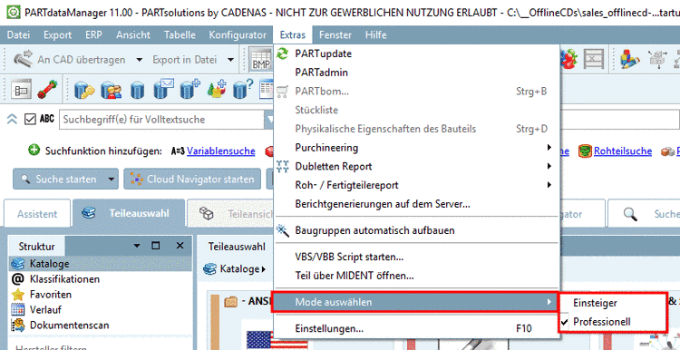 The selection of the desired mode happens in PARTdataManager under Extras menu -> Select mode. The default mode is stated in $CADENAS_DEFAULTUSER/partsolu.cfg -> block [TWEAKMENU] -> key "PARTdataManager_Mode" or "PARTproject_Mode". The respective menu item is displayed, if the key ModePreferences is set on true in the respective block.