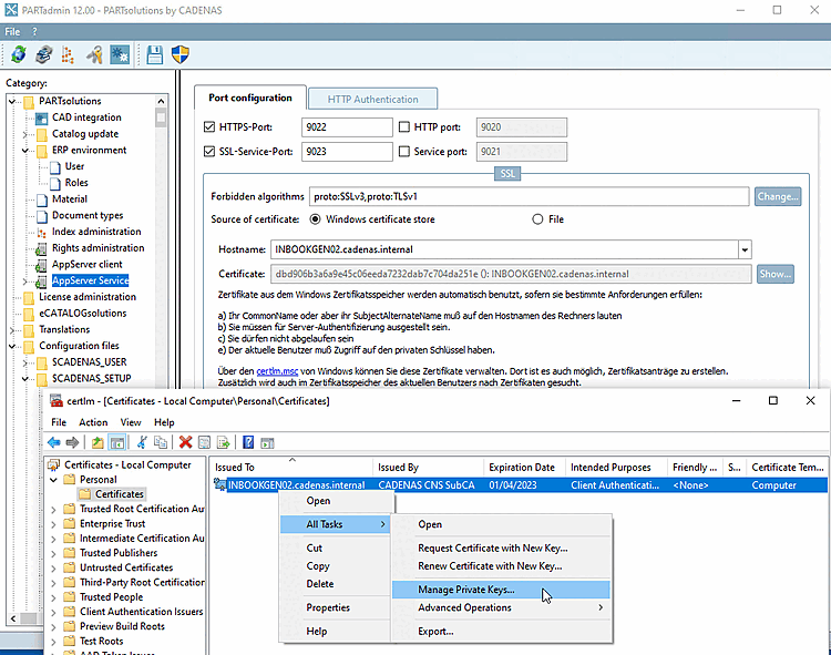 Make sure that the user accessing the AppServer has permissions for the used certificate.