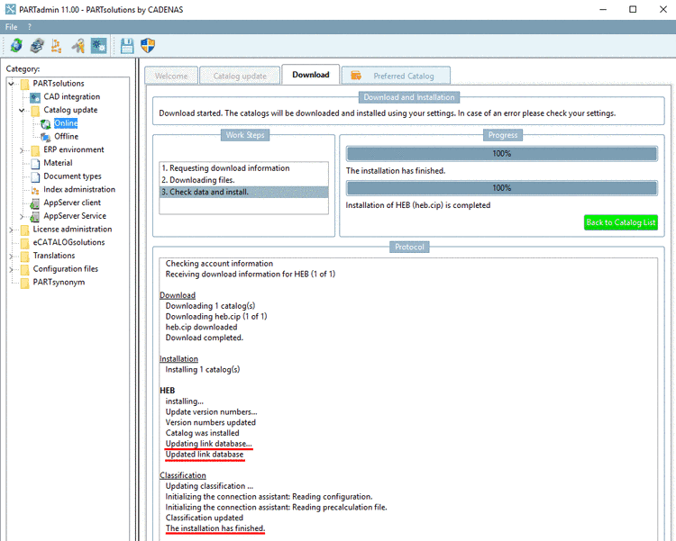 Perform the installation of an update version in PARTadmin under Catalog update.