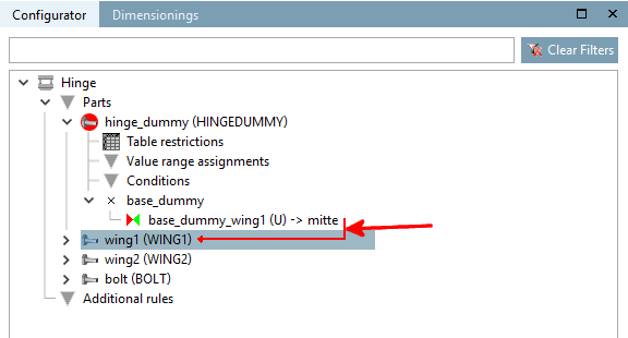 Opens the tree and shows the links [Links] between the connection point [Connection point] and the connection part [Connection part].
