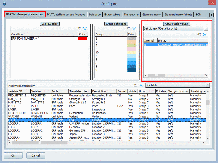 Setting in user interface under PARTlinkManager -> Extras menu -> Configure dialog box -> PARTlinkManager preferences tab -> Adjust table values -> Set bitmap (PDataMgr only)