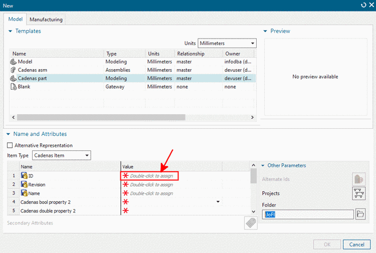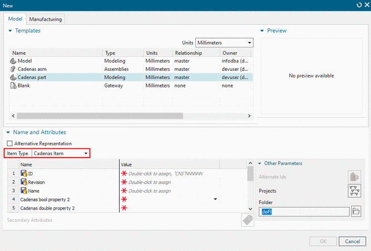 In this example we want to use the templates (seed part) CNS_METRIC_TEMPLATE and CNS_INCH_TEMPLATE and the Item Type "C4_CadenasItem" (names exemplarily), which is an item type with mandatory properties.