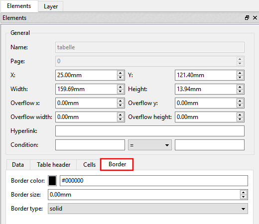 Example table: Layout defined via frame color [Border color], frame thickness [Border size], frame type [Border type]