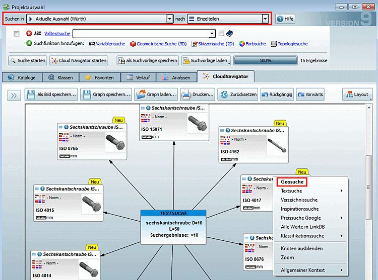 Call up the context menu on the desired component and click on Geosearch [Geometric Search].