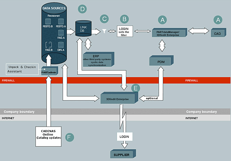 The following illustration shows the entire workflow between CAD, PARTsolutions, PDM/ERP, LinkDB, catalogs and external connections.