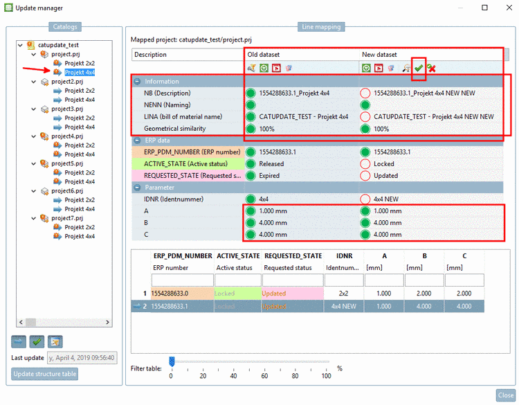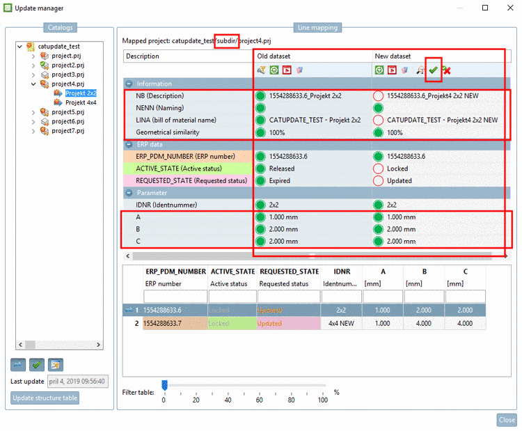 In the Update manager, a successful mapping can be seen from the fact that in the dialog area Line mapping both the column Old dataset and the column New dataset contain data.