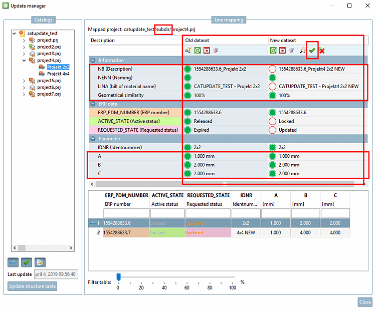 In the Update Manager [Update manager], you can recognize a successful mapping by the fact that both the Old data record [Old dataset] column and the New data record [New dataset] column contain data in the Row assignment [Line mapping] dialog area.