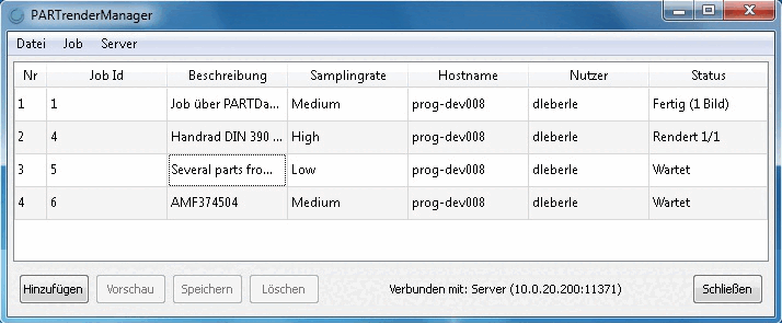 The jobs in the list are always transferred from the server and displayed in such a way that the jobs that have already been completed come first. They are followed by the job that is currently being processed by the server and finally the waiting jobs whose images have not yet been calculated. The index number numbers the entire list and only plays a role for the waiting jobs, as it can be used to change the sequence. The number can be changed by double-clicking and a job can be moved up in the list so that it is processed earlier by the server.